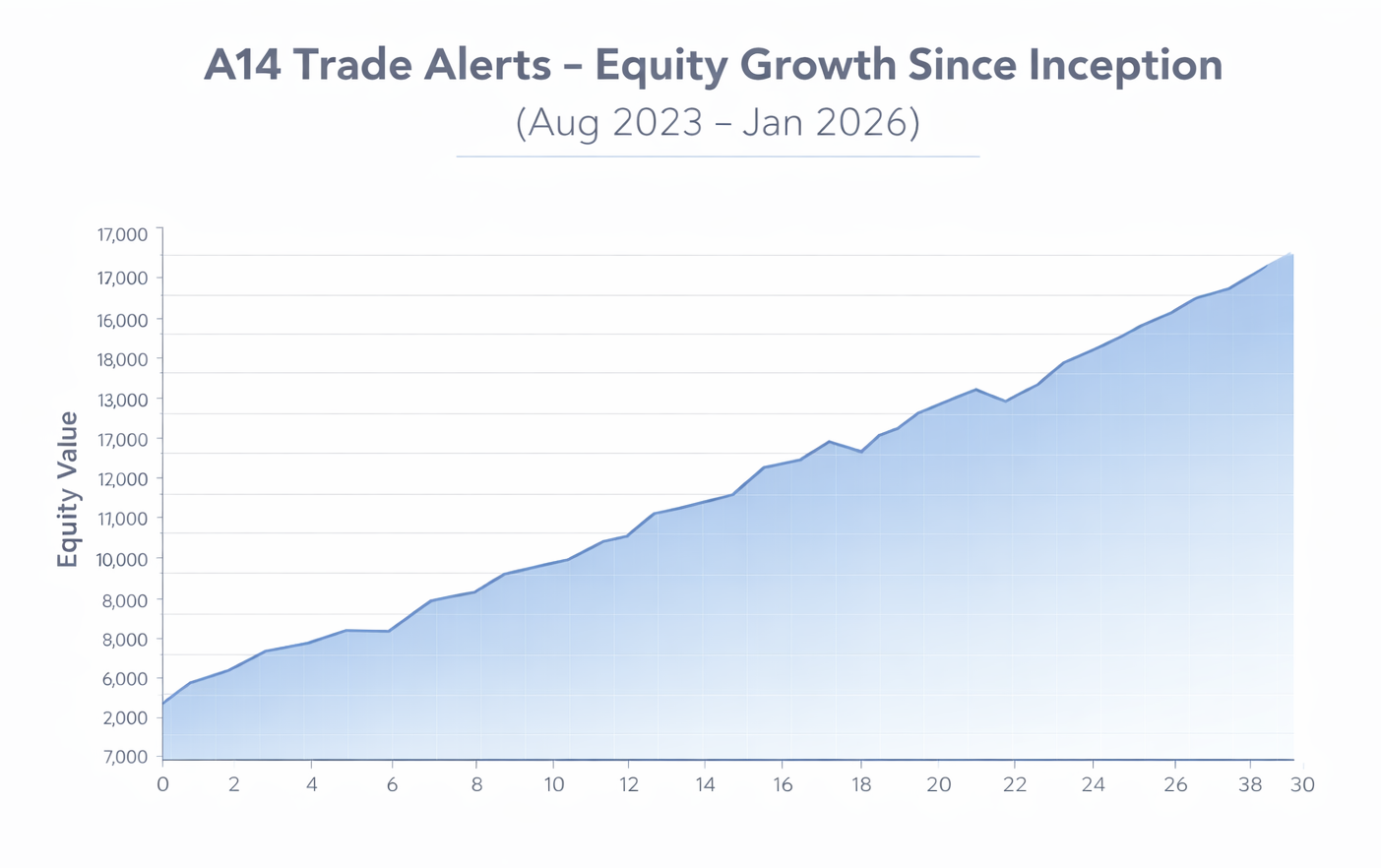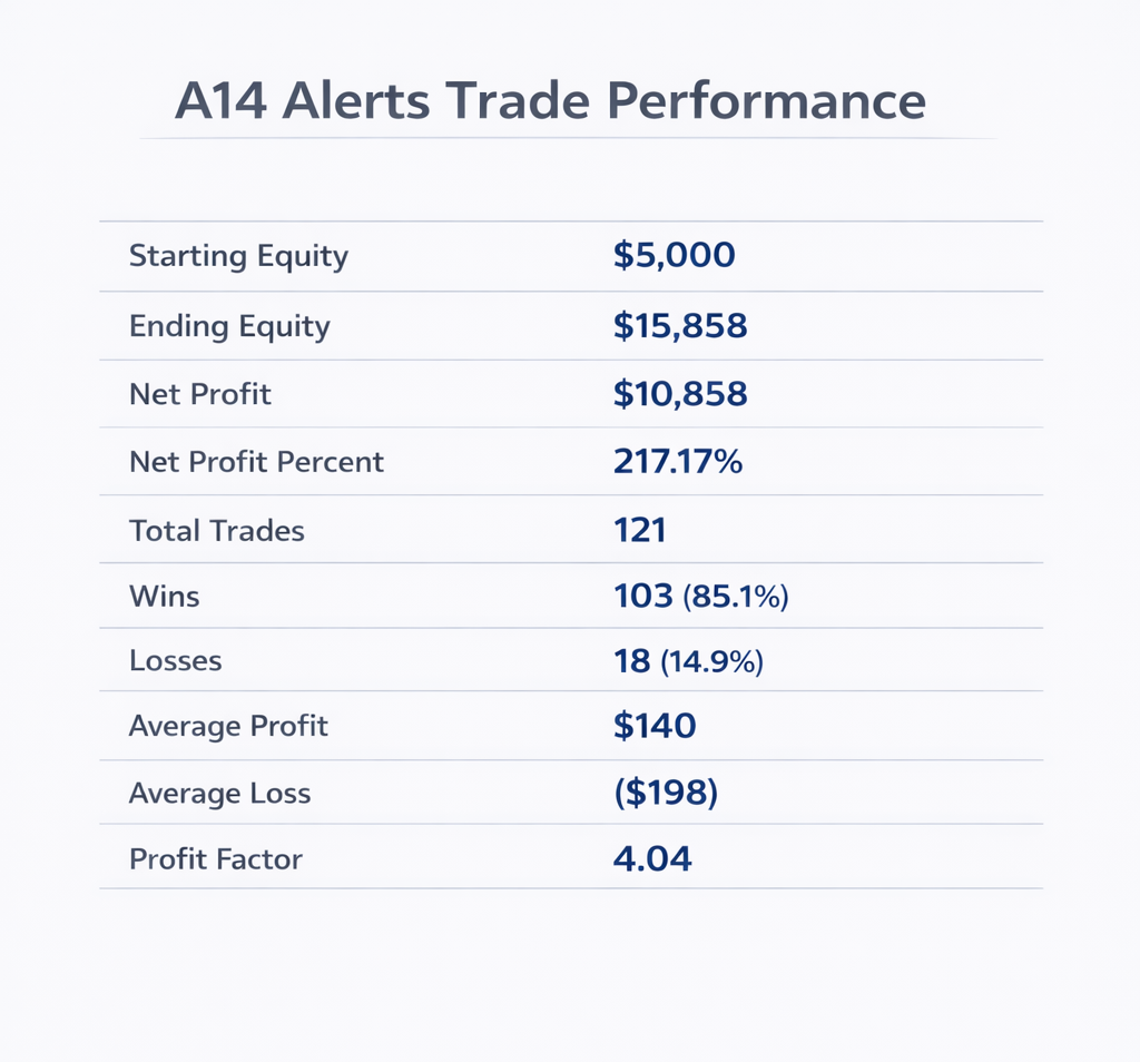 The alerts are based on real trades placed in real time and are designed to demonstrate consistent execution of the A14 strategy. To keep the performance results clear and conservative, the alerts are traded using the same position size each week. Even without compounding, the results demonstrate how powerful repeatable execution of this strategy can be.